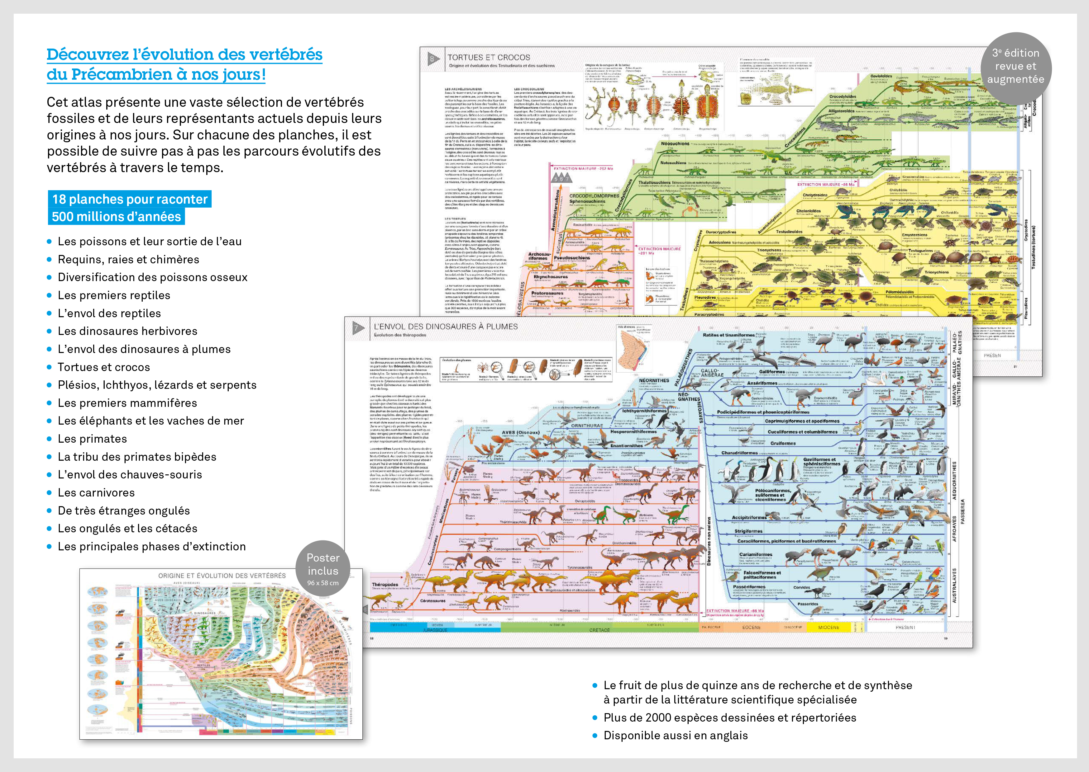 Cet atlas présente une vaste sélection de vertébrés fossiles et de leurs représentants actuels avec les liens probables qui les unissent depuis leurs origines à nos jours. Sur chacune des planches, il est possible de suivre pas à pas les changements à travers le temps, qui ont produit les formes actuelles de vertébrés.