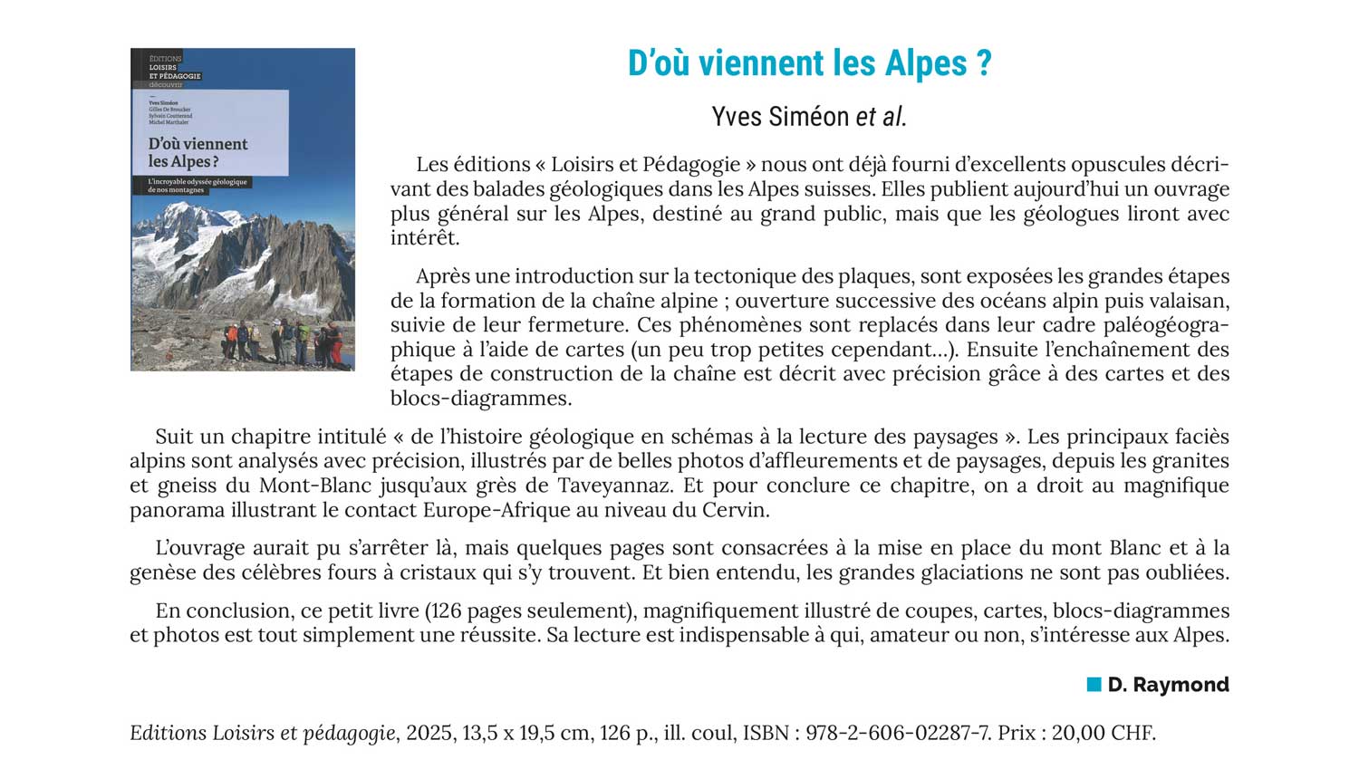 Ce livre retrace le destin géologique d’une chaîne de montagnes: les Alpes. Il s’adresse à tous les enseignants et plus généralement à tous les passionnés et curieux de nature qui, se promenant dans nos montagnes, se posent des questions en admirant les beaux paysages géologiques qui les entourent. Comment ont pu se former ces reliefs? Pourquoi dit-on qu’il y a eu des mers, des océans? Quels rôles ont pu jouer les glaciers, jusqu’où ont-ils bien pu aller? Tous ceux qui ont suivi les auteurs dans leurs différents Géofestivals alpins reconnaîtront les nombreux dessins de ce livre et de bons moments leur reviendront en mémoire. Les autres auront une base solide pour aller randonner sur les nombreux sentiers alpins.
